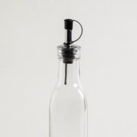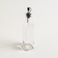Aceitera cuadrada de vidrio. Diseño liso. Pico de acero. Capacidad: 270ml
