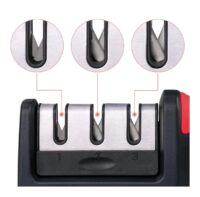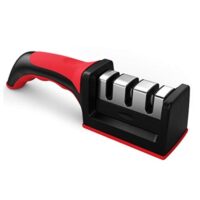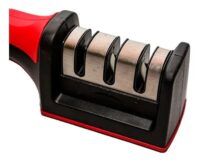Marca Crystal Rock. Afilador de cuchillos piedra cerámica doble. Plástico y acero inoxidable. Color rojo y negro. Base antideslizante. Tipos de afilado: 1-grueso, 2-fino, 3-acabado. Sistema extraíble. Apto para zurdos. Largo: 21cm. Ancho: 5cm. Alto: 6cm