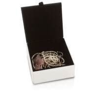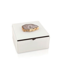 Caja de vidrio biselado color blanco puro con piedra natural, que nos invitan a un estado de ánimo veraniego y fresco. Dimensiones: 12x12x7cm.