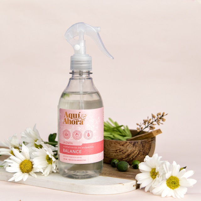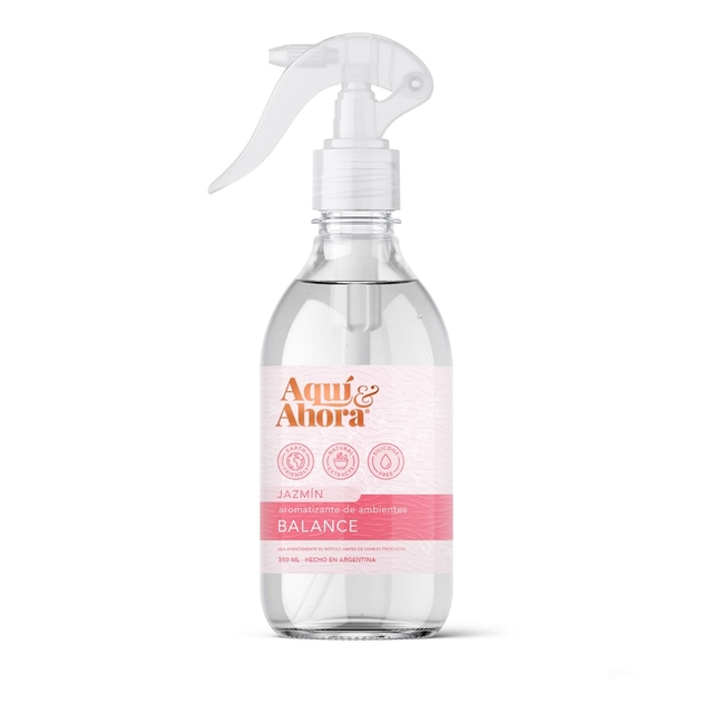 Aromatizante de ambiente y tela. Línea Aquí y ahora, esencia premium de jazmin para transformar los espacios de tu casa y darles un perfume fresco y agradable. También podes perfumar las fibras de tu ropa, ropa de cama y hogar. Elaborado por laboratorio certificado. Contiene extractos naturales. Libre de parabenos y aceite de palma. Contenido: 350ml.