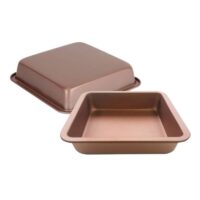 Asadera cuadrada con dos capas de antiadherente. Color cobre. Apto horno eléctrico y a gas. Apto lavavajillas. Dimensiones: 22,5×22,5x5cm