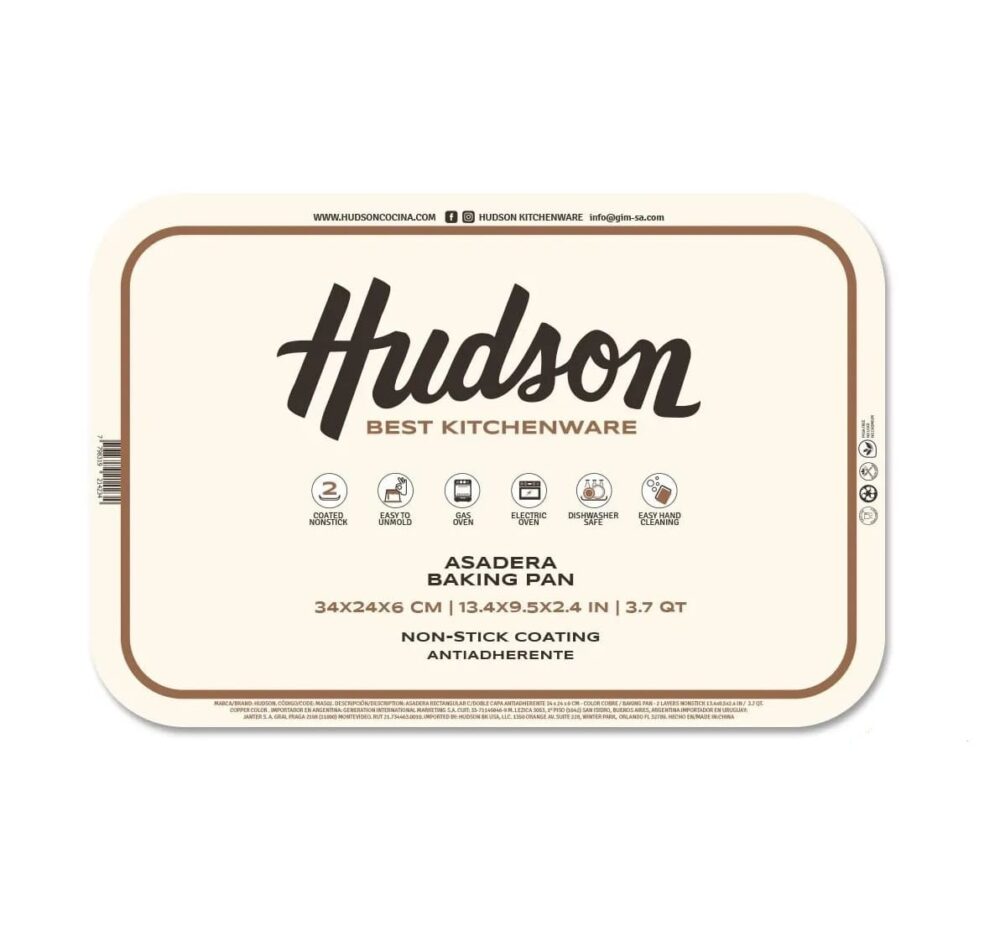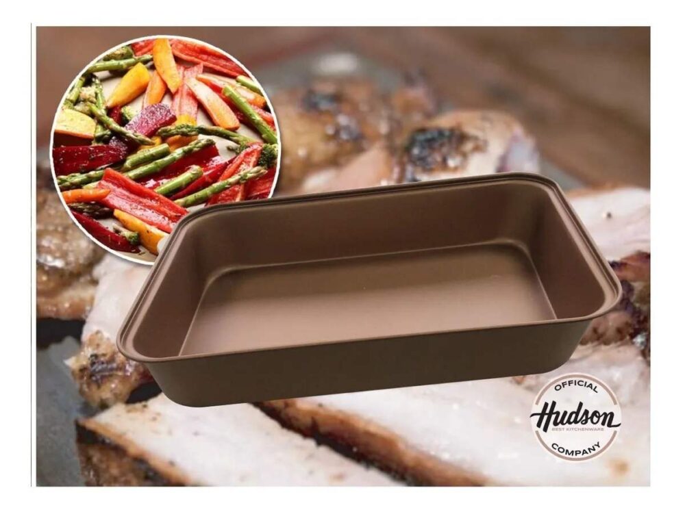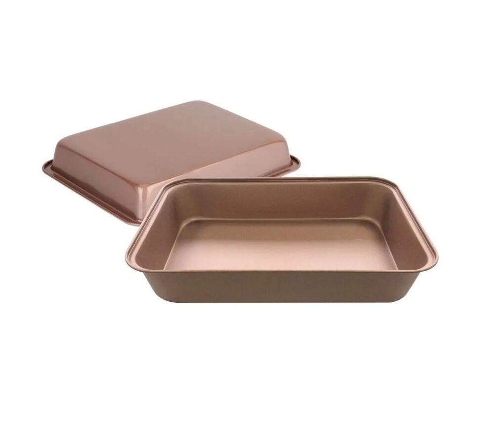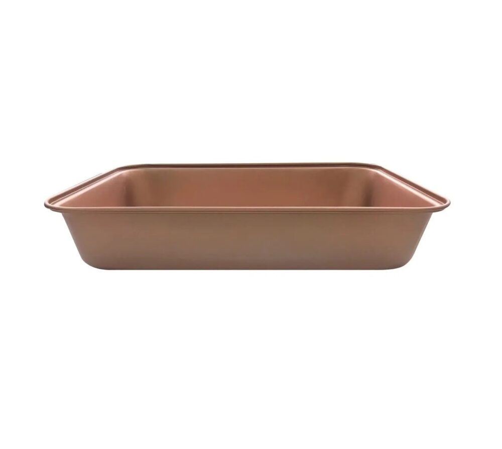 Asadera rectangular color cobre con doble capa de antiadherente cerámico. Apto horno eléctrico y a gas. Apto lavavajillas. Largo: 34cm Ancho: 24cm. Alto: 6cm.
