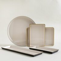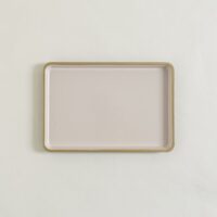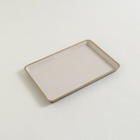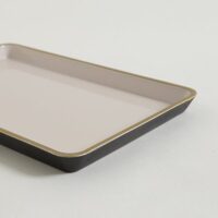 Bandeja de polipropileno. Color natural con borde dorado y base negra. Largo: 32cm. Ancho: 22cm. Alto: 2cm