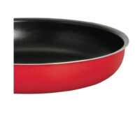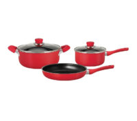 Batería de 5 piezas color rojo. Alumino de 1,6mm de espesor con doble capa de antiadherente. Mangos revestidos en pintura siliconada, suaves al tacto y antitérmicos. Tapas de vidrio templado con válvula de vapor. Base con anillos difusores, para una distribución rápida y uniforme del calor. Apto lavavajillas. Apto cocina a gas, cerámicas y eléctricas. No utilizar fuego excesivo. Incluye: Cacerola con asas 24cm de diámetro, 10cm de alto, capacidad 3,93l; Cacerola con mango 18cm de diámetro, 8,50cm de alto, capacidad 2,01l; Sartén 24cm de diámetro, 4,50cm de alto, capacidad 1,4l, Tapa de vidrio templado 24cm de diámetro, Tapa de vidrio templado 18cm de diámetro.