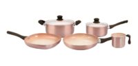 Batería de 7 piezas color cobre. Alumino de 2mm de espesor con triple capa de antiadherente cerámico color degradado. Mangos y asas revestidos en pintura siliconada, suaves al tacto y antitérmicos. Tapas de vidrio templado con válvula de vapor. Base con anillos difusores, para una distribución rápida y uniforme del calor. Apto lavavajillas. Apto cocina a gas, vitrocerámicas y eléctricas. No utilizar fuego excesivo. Incluye: Cacerola con asas 24cm de diámetro, Cacerola con mango 18cm de diámetro, Sartén 24cm de diámetro, Bifera 26cm, Jarro hervidor 11cm, Tapa de vidrio templado 24cm de diámetro, Tapa de vidrio templado 18cm de diámetro.