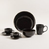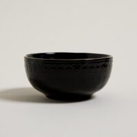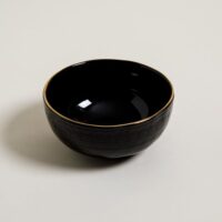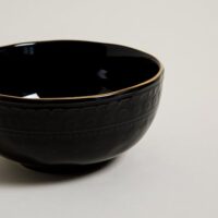 Bowl de cerámica con textura. Esmaltado brillante color negro. Borde Dorado. Diámetro: 15cm. Alto: 7cm
