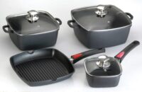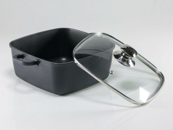 Marca Jovifel. Cacerola de fundición de aluminio de 5mm de espesor. Diseño cuadrado. Doble capa antiadherente. Tapa de vidrio templado con válvula para vapor, borde y manija de acero inoxidable. Apto cocina a gas, elécticas y vitrocerámicas. Largo: 24cm. Ancho: 24cm. Alto: 11cm. Capacidad: 5l