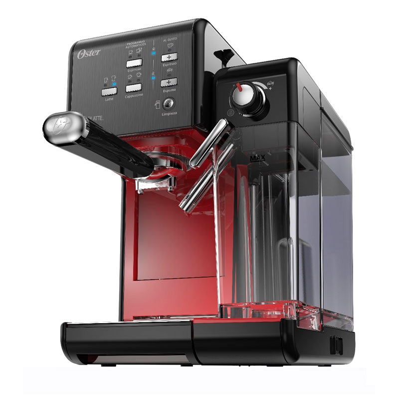 Marca Oster. Cafetera espresso primalatte. 19 bares de presión. Automática / Manual. Para Cappuccino, Latte y Espresso. Para café molido o cápsulas Original Line de Nespresso. Depósito de agua removible de 1.5 lts. Depósito de leche extraíble de 375ml. Perilla control de espuma de leche.