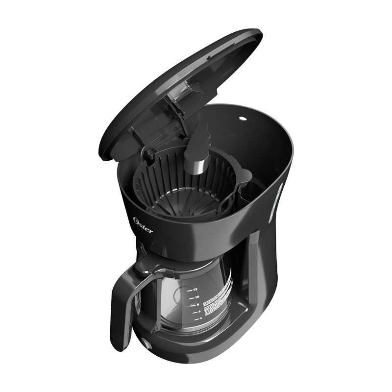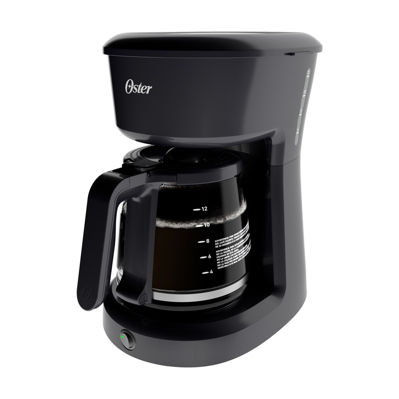 Marca Oster. Cafetera de Filtro. Modelo DSC12B. Capacidad para 12 tazas. Filtro permanente de nailon lavable. Canasta de café removible. Función de pausa para servir. Luz indicadora. Indicador doble de nivel de agua. Espacio para guardar cable en base.