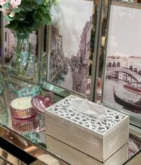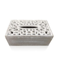 Caja de pañuelos descartables de madera calada. Decapado color blanco mate, efecto gastado. Elegante y de estilo marroquí, sobre todo cómodo para poder colocar los pañuelos de uso cotidiano, es un accesorio infaltable para que tu deco. Ideal para el escritorio, baño o mesa. Dimensiones: 24,5x14x9cm