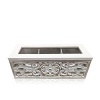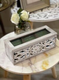 Caja de madera calada y 3 divisiones para té color blanco gastado. Estilo vintage de inspiración marroquí. Versátil, puede usarse como joyero y organizador. Dimensiones: 23,5x9x8cm