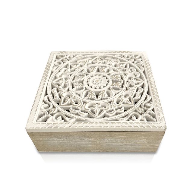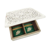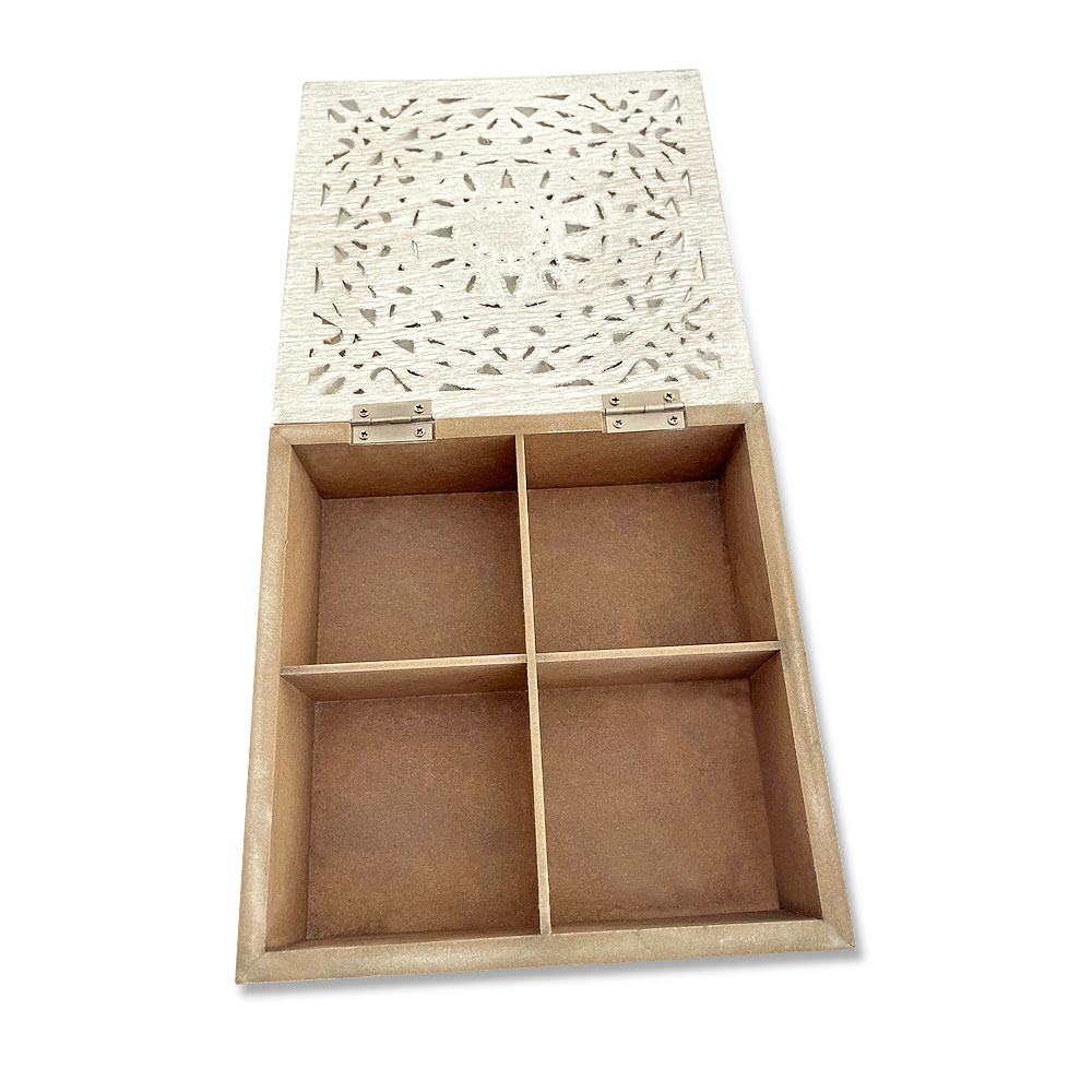Caja para té. Madera calada color blanco gastado con 4 divisiones. De inspiración marroquí y efecto descontracturado. Tu mesa lucirá super canchera y moderna. Dimensiones: 18x18x7cm.