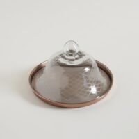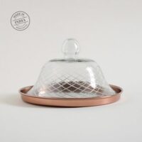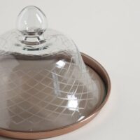 Campana de vidrio. Base metálica color cobre. Diámetro: 29cm. Alto: 16cm