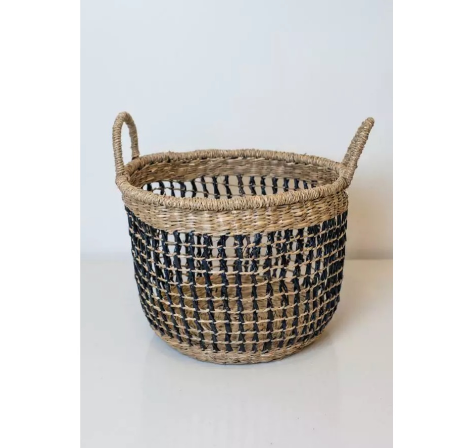 Cesto de Seagrass tipo red en color natural y negro. Debido al material de fibras naturales, el cesto es flexibles y puede variar levememente su forma. Medidas: 31x21cm