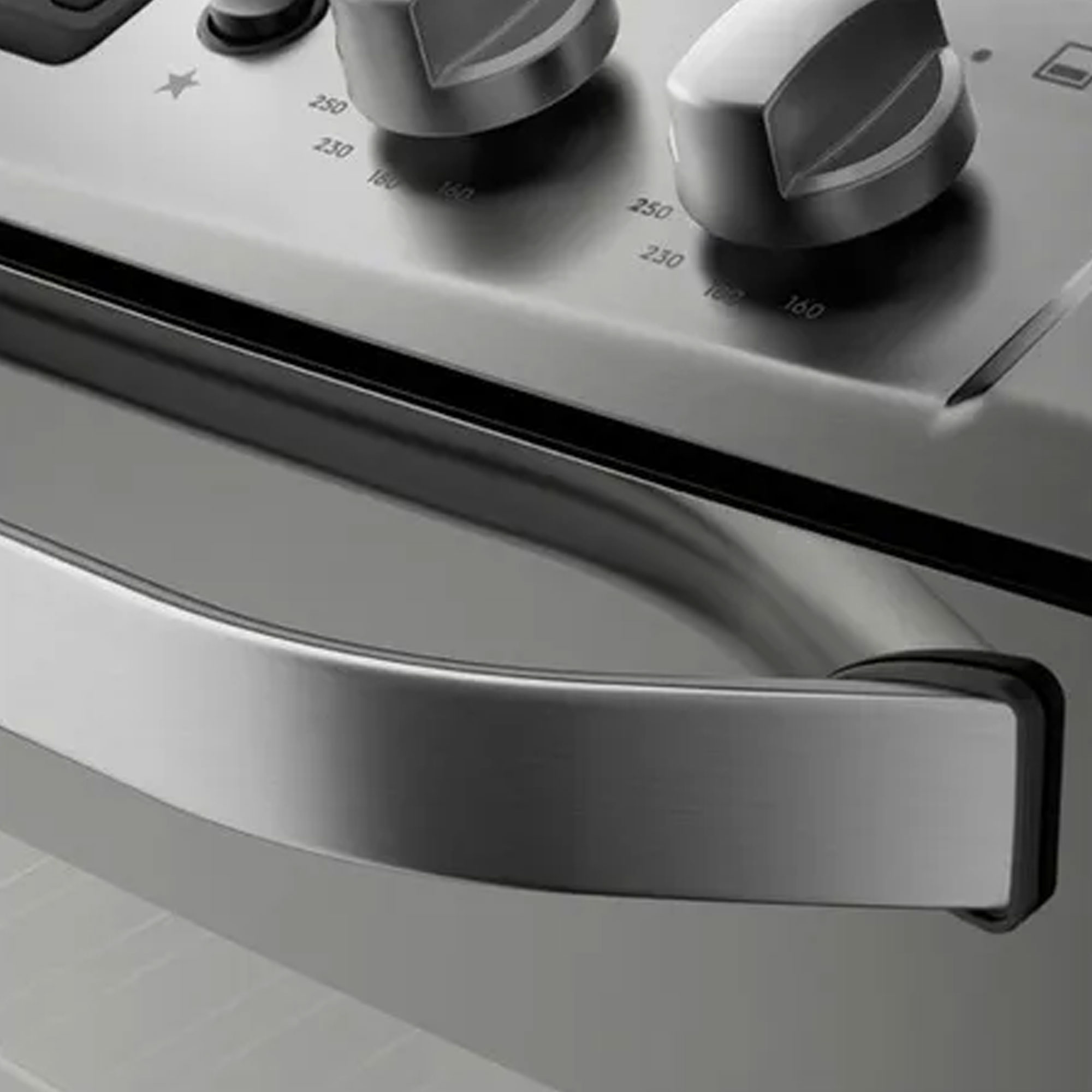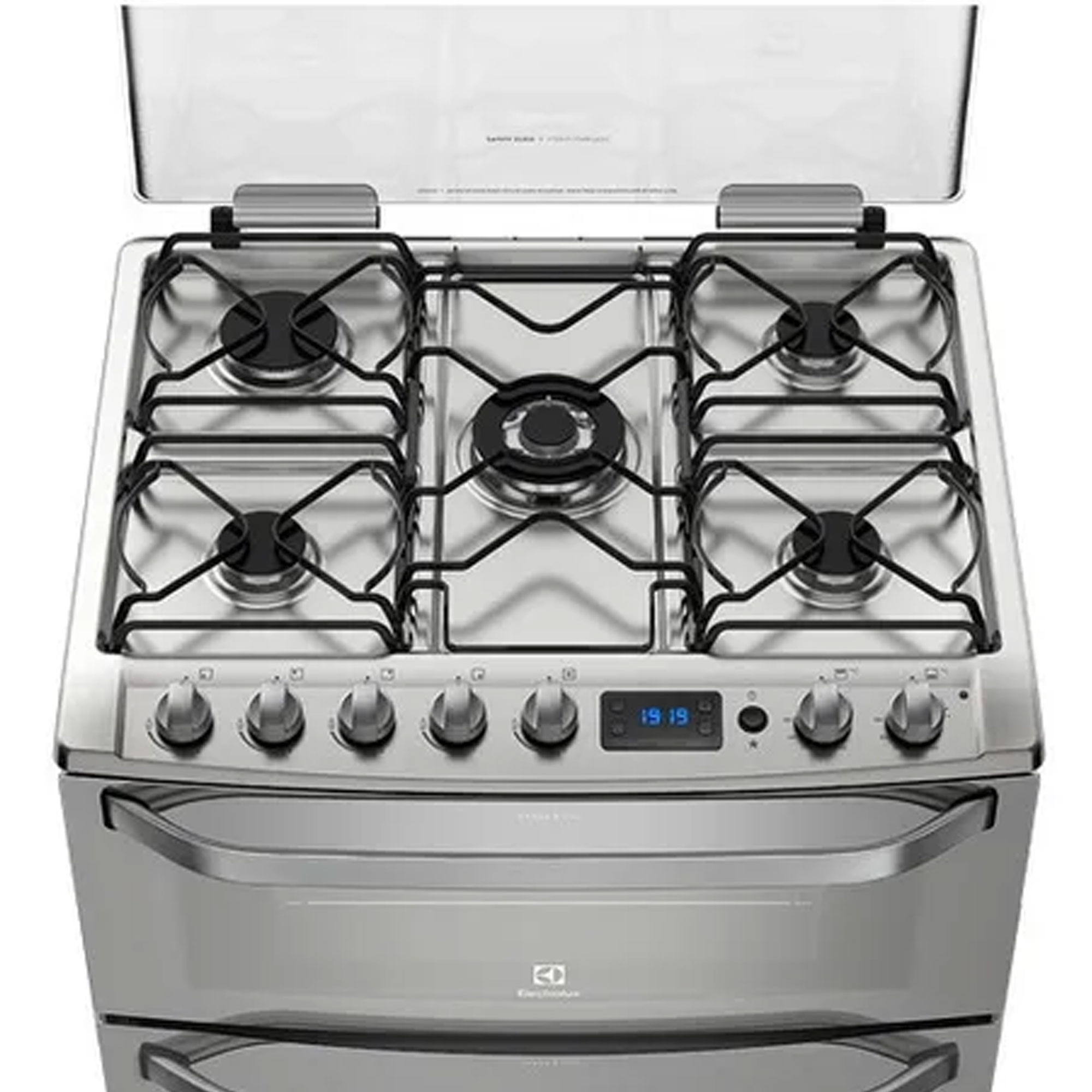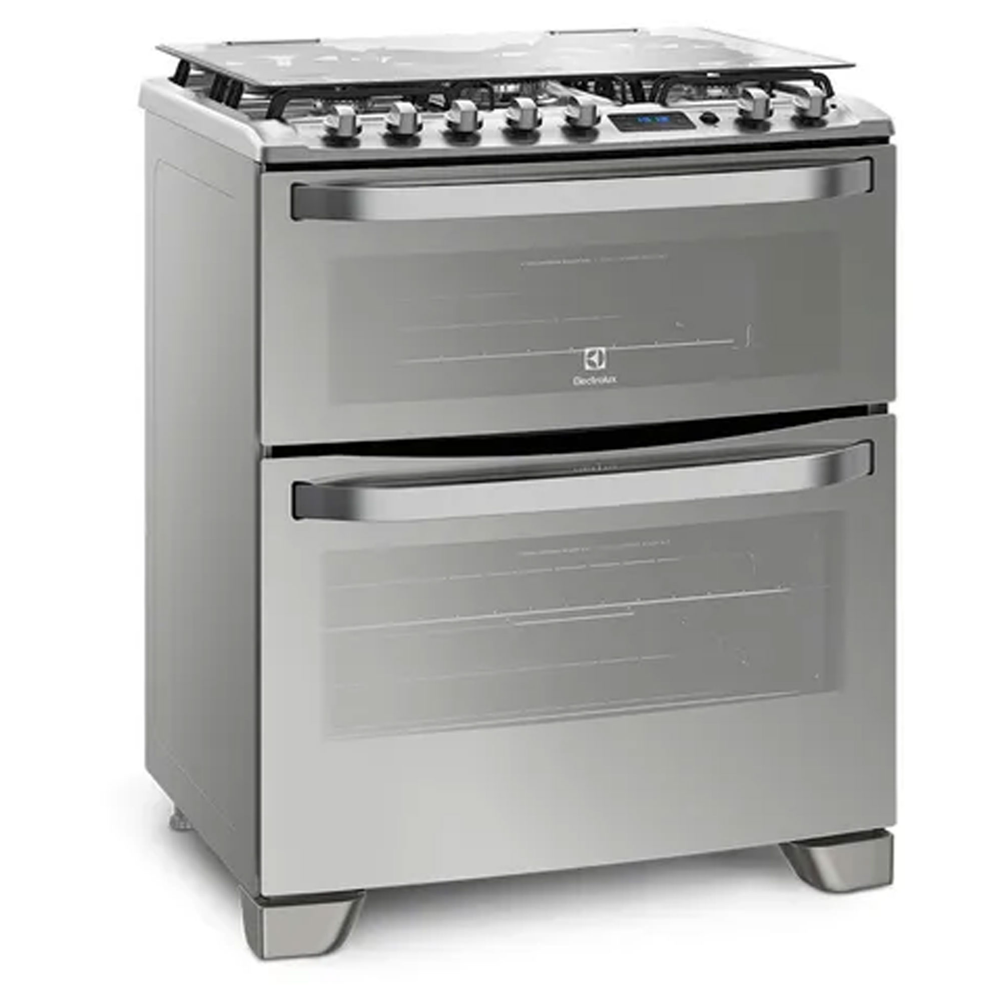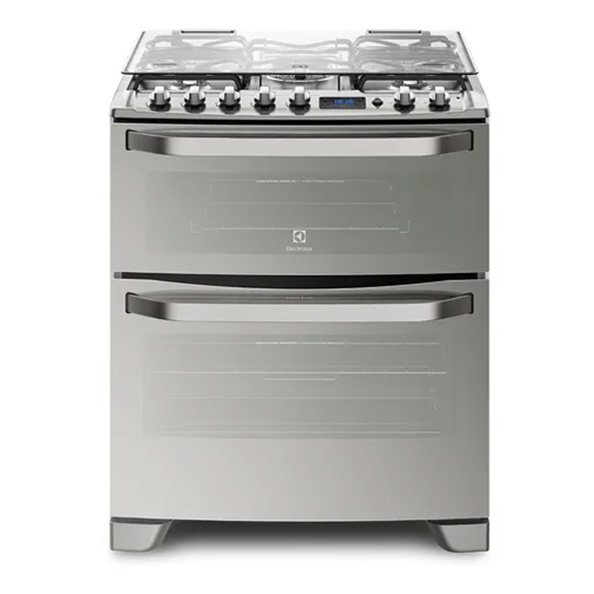 Marca Electrolux. Cocina a gas. Modelo 76DXR. Acero inoxidable. Horno doble. 5 hornallas. Rejillas enlozadas. Display digital. Horno con grill. Tipo de alimentación: gas/eléctrica. Voltaje 127V/220V. Puerta con visor. Gas natural. Cuenta con luz interior para controlar la cocción. Con encendido electrónico para mayor comodidad. Temporizador. Capacidad de 125,1L. Dimensiones: 76,2cm de ancho, 145,5cm de alto y 107,4cm de profundidad. Peso: 58.5kg