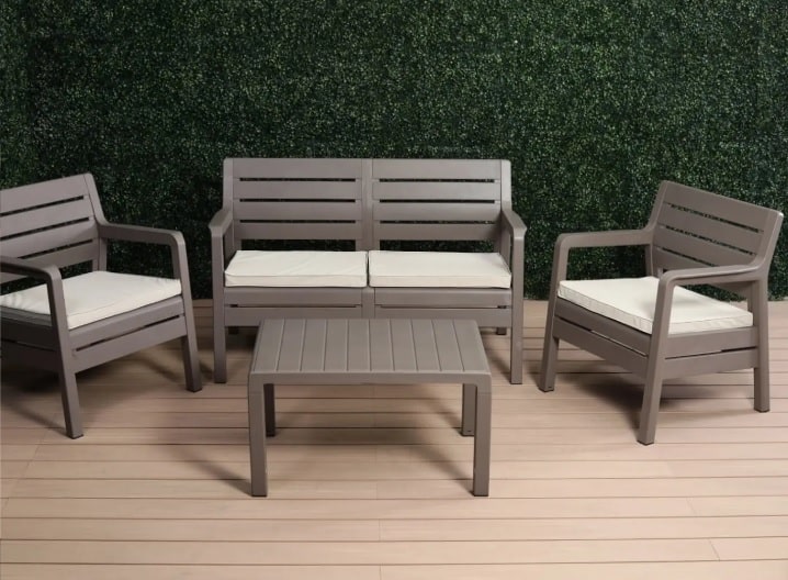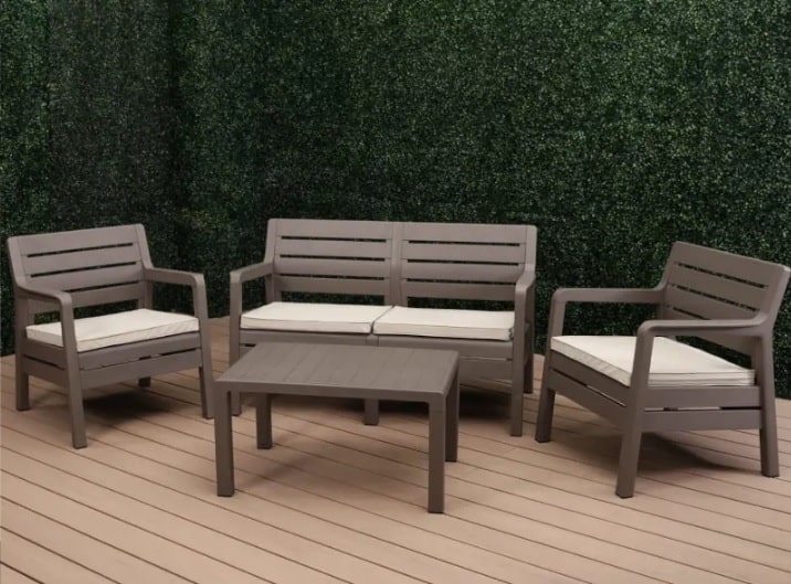Combo de 1 mesa baja + 2 sillones individuales + sillon dos cuerpos color capuchino. Mesa París. Plástico con textura símil madera. Ideal para exteriores, ya que resisten la intemperie, tienen filtro UV y filtro luz, no pierde propiedades mecánicas y no se degrada el color. Almohadones de tela plástica impermeable.