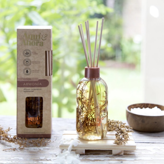 Difusor de ambiente. Línea Aquí y Ahora, esencia premium de Coco con flores naturales en su interior. Elaborado con extractos naturales, sin parabenos. Libre de aceite de palma. Contenido: 250ml. Duración estimada: Aproximadamente entre 45 y 60 días, dependiendo de las condiciones del ambiente donde se lo coloque.