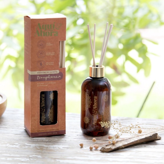 Difusor de ambiente. Línea Aquí y Ahora, esencias Premium de la India. Envase impreso y tapa dorada metalizada. Elaborado con extractos naturales, sin parabenos. Libre de aceite de palma. Contenido: 250ml. Duración estimada: Aproximadamente entre 45 y 60 días, dependiendo de las condiciones del ambiente donde se lo coloque.