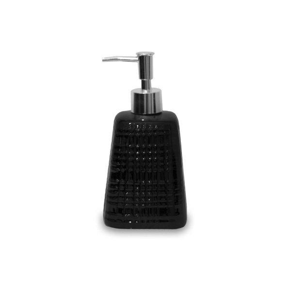Dispenser para jabón líquido. Cerámica color negro con trama cuadrícula en relieve. Dimensiones: 18×8,5cm