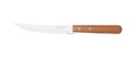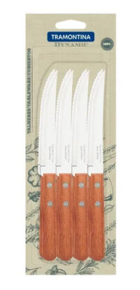 Marca Tramontina. Línea Dynamic. Cuchillos de mesa de 5″, especial asado. Láminas de acero inoxidable con filo dentado. Mango de madera natural. Remaches de aluminio. Largo: 20,5cm. Unidades por blister: 12