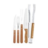 Marca Tramontina. Línea Dynamic-Churrasco. Juego de cubiertos para asado. Láminas de acero inoxidable. Mango de madera natural. Remaches de aluminio. Incluye: 1 cuchillo chef 8″ dynamic, 1 tenedor trinchante dynamic, 1 pinza para carne churrasco, 6 cuchillos para asado/frutas 5″ dynamic, 6 tenedores de mesa dynamic.