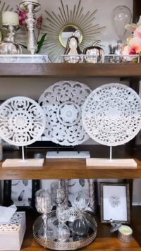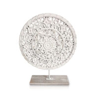 Escultura de madera blanca tallada con flores de estilo marroquí en pie de madera. Para lucir tus estantes, bibliotecas o como objeto deco, tus ambientes se verán más cancheros y glamorosos. Dimensiones: 25x6x33cm