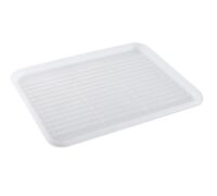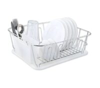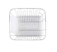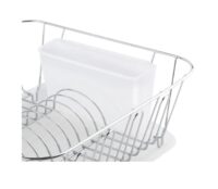 Escurridor de platos de acero cromado. Bandeja y cubiertero colectores de agua de plástico. Base engomada. Espacio para 12 platos. Color natural translúcido. Largo: 37cm. Ancho: 33cm. Alto: 13,5cm
