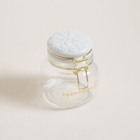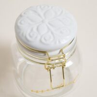 Frasco contenedor cuadrado de vidrio con logo frontal en dorado. Tapa de cerámica labrada color blanca con sistema de cierre hermético en dorado. Línea Essential. No apto lavavajillas ni microondas. Capacidad: 750ml.