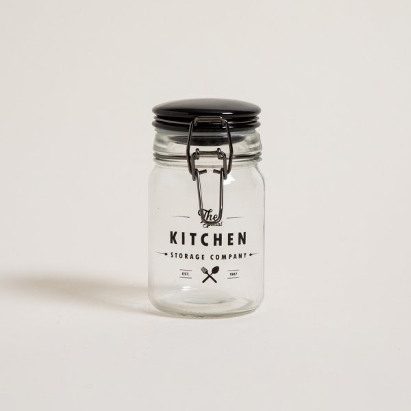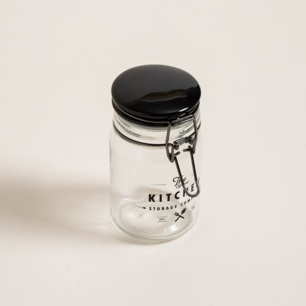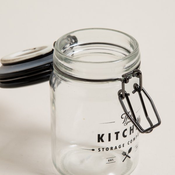 Frasco especiero redondo de vidrio Storage Company. Cierre hermético tipo gancho color negro. Tapa cerámica negra. Capacidad: 250ml