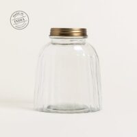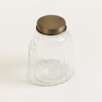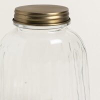 Frasco de vidrio. Tapa bronce. Capacidad: 1,8l. Alto: 19cm. Ancho: 18,4cm. Largo: 17,6cm