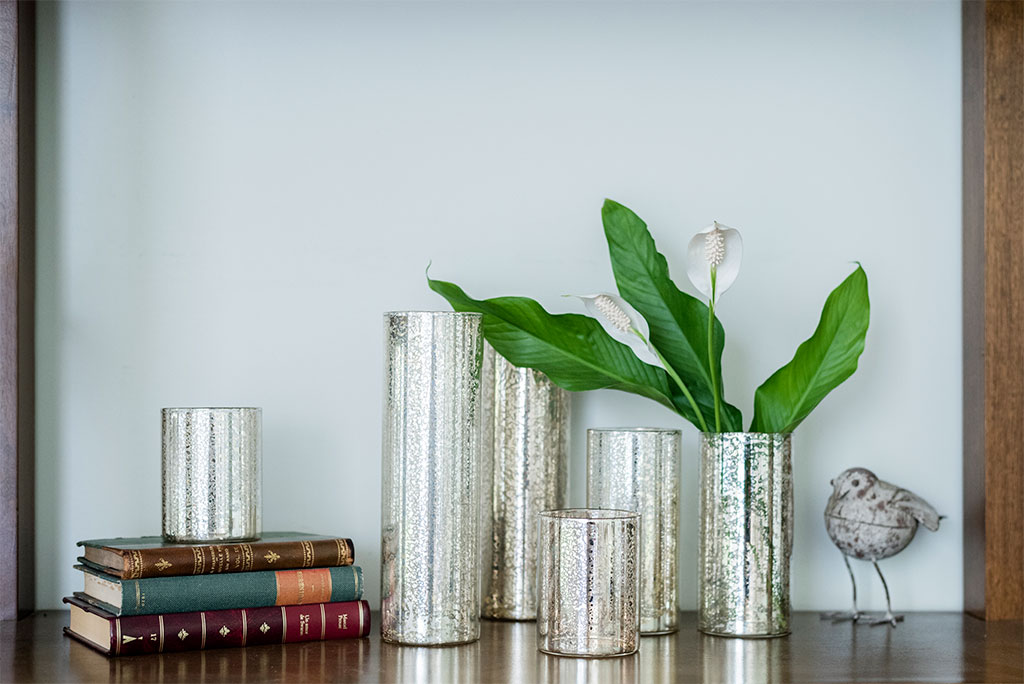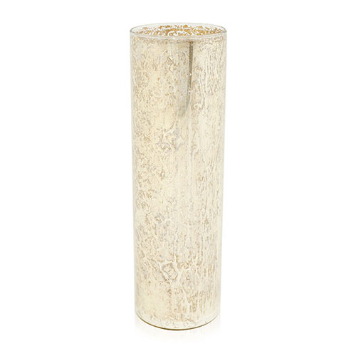 Florero de vidrio mercurizado efecto envejecido color dorado. Cilindro de línea simple. Ideal para combinar con similares de otros tamaños y ambientar con elegancia. Dimensiones: 8x20cm