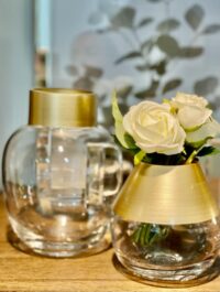 Jarrón de vidrio Elm. Detalle de acabado metálico color dorado. Diseño moderno. Ideal para combinar varios tamaños y lograr una deco con estilo. Dimensiones: 13x17cm