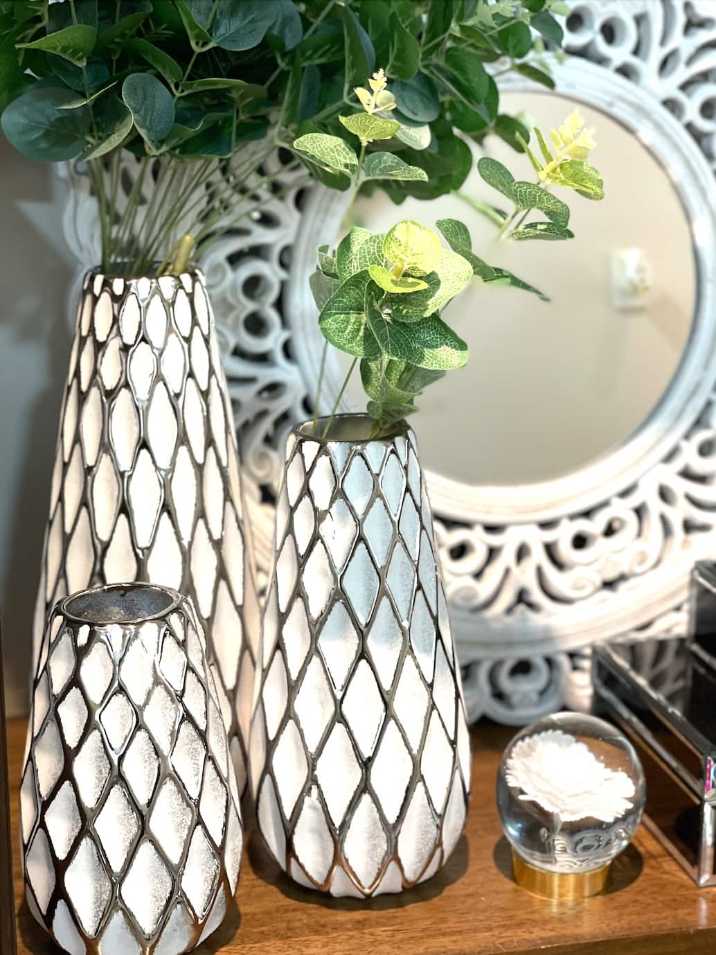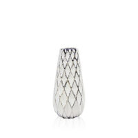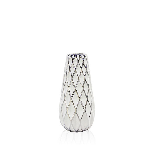 Jarrón de Cerámica blanca con detalles en plata. Trama en relieve. Inspirate y transformá tu casa en un lugar con personalidad propia! Ideal para exhibir flores o sumar un toque de color agrupados con otros jarrones. Dimensiones: 10x18cm