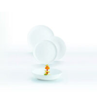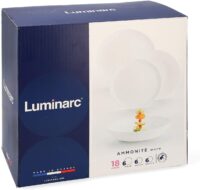 Marca Luminarc. Modelo Amonite. Juego de vajilla de vidrio templado color blanco. Incluye 6 platos playos, 6 platos hondos, 6 platos de postre. Apto microondas. Apto lavavajillas. Resistente a choques térmicos. Resistente a impactos. Resistente temperaturas elevadas hasta 110°C