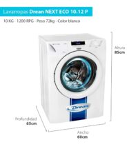 Marca Drean. Lavavarropas Automático Drean Next. Modelo 10.12 P ECO. Capacidad 10kg. Tecnología INVERTER. 1200 RPM. Máxima Eficiencia Energética: A+++. Sistema de lavado Europeo. Color Blanco. 34 Alternativas de Lavado con lavados rápidos de 30 y 45 minutos. Mantenimiento Predictivo. Luz Interior de Tambor. Perilla Bidireccional. Puerta Extra Grande. Tambor Elevado. Jabonera con Dispensers Específicos. Súper Económico (ahorra hasta un 20% respecto a un motor de Clase A). Funciones especiales como: Autobalance. Hand Wash. Efecto Soft. Eco Wash. Inicio Diferido. Control de Temperatura. Carga Autoadaptativa.