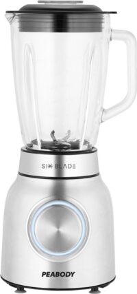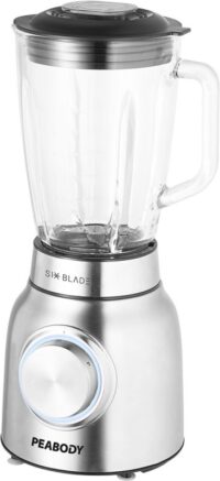 Marca Peadody. Licuadora de mesa. Potencia: 1000W. 5 velocidades + función Pulso. 6 cuchillas de acero inoxidable. Jarra de vidrio de 1,5 lts de capacidad. Jarra resistente a amplia gamas de temperatura (0-60°C). Tapa con dosificador de 50 ml. Hasta 21.500 rpm. Apta para picar hielo. Perilla de control con luz LED blanca. Ancho: 21cm. Profundidad: 21cm. Alto: 43cm. Peso: 4.1Kg. Color: INOXIDABLE