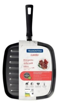 Marca Tramontina. Línea Loreto. Bifera/grill de aluminio revestido en teflón. Antiadherente. Apto cocción a gas, eléctrica y vitrocerámica. Apto lavavajillas. Largo: 46cm. Ancho: 24cm. Alto: 2cm. Alto total: 11,2cm