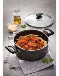 Marca Tramontina. Línea Loreto. Cacerola de aluminio revestido en teflón. Antiadherente. Tapa de vidrio templado. Asas de baquelita, antitérmicas. Apto cocción a gas, eléctrica y vitrocerámica. Apto lavavajillas. Largo: 36,2cm. Ancho/diámetro: 24cm. Alto: 16,7cm. Capacidad: 4,9l
