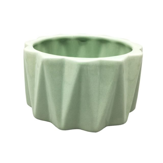 Maceta geométrica baja. Cerámica esmaltada color verde. Dimensiones: 12x12x7cm