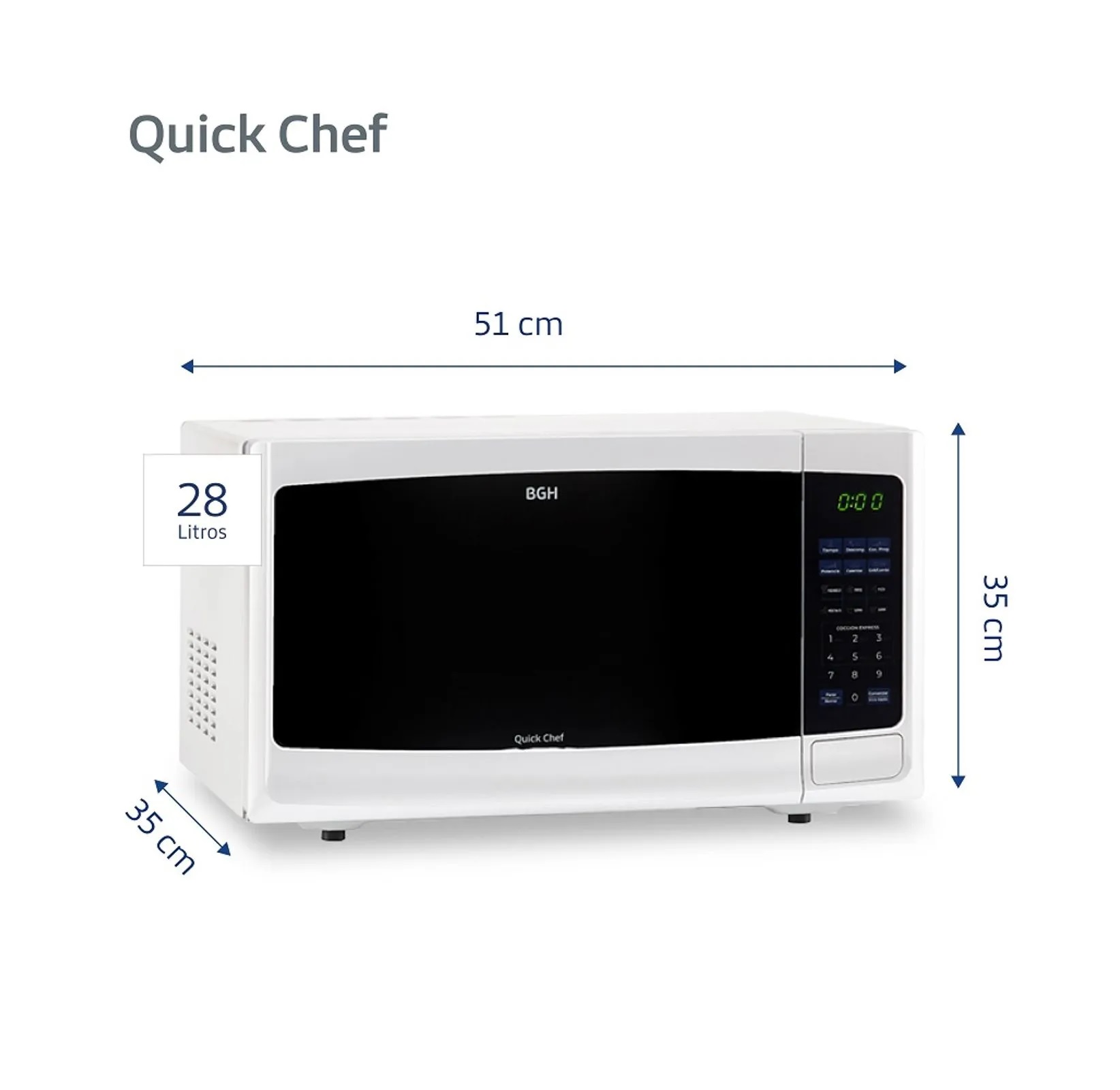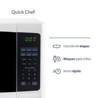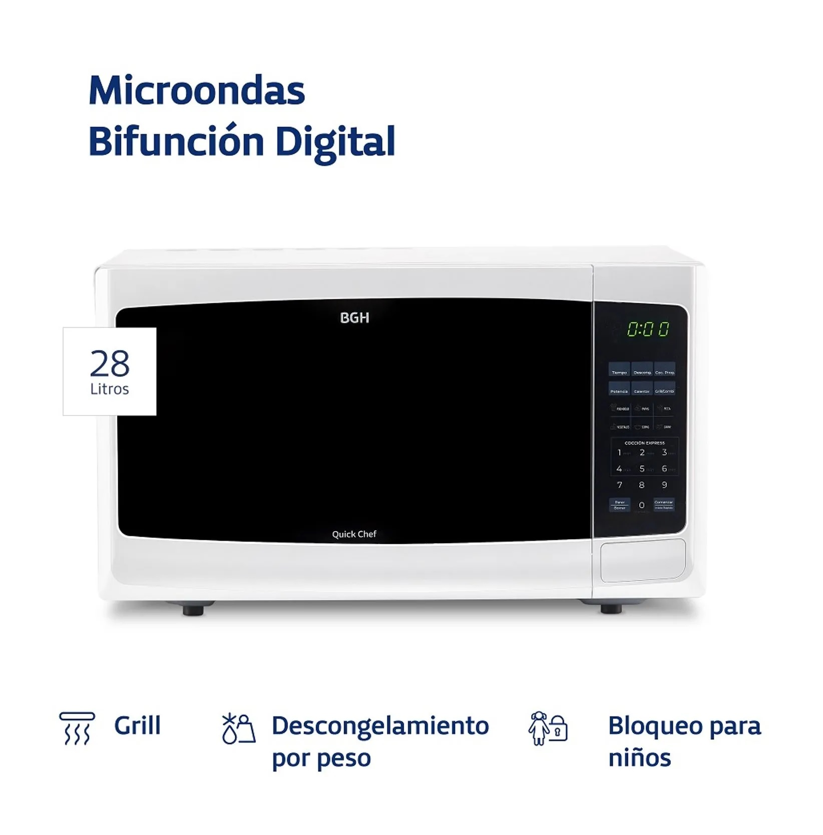 Marca BGH. Cocina Microondas Digital + Grill. Modelo B228DB9. 28 litros de capacidad. Además de calentar y descongelar, cociná, dorá y tostá tus comidas con la función grill. Comidas doradas y crocantes. Podés tostar panes, empanadas y todo tipo de masas. Control Digital: seleccioná el tipo de comida, configurá el tiempo y la función deseada para cocinar automáticamente, con 10 niveles de cocción. En simples pasos podés programar el timming para cocinar con potencias diferentes. Descongelamiento Automático. Cocina tu plato preferido con sólo seleccionar el tipo y el peso del alimento. Potencia 900W. Dimensiones (Al x An x Prof): 30,6×51,3×38,9cm. Peso: 14,9kg