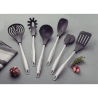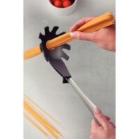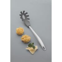Marca Tramontina. Línea Movin. Servidor de pastas de nylon color gris. Mango de acero inoxidable. No daña ninguna superficie, tanto antiadherente como cerámica. Resiste temperaturas de hasta 180 °C. Posee medidor de porción. No retiene olores ni mancha. Apto lavavajilla. Largo: 35,1cm. Largo del mango: 23,2cm.