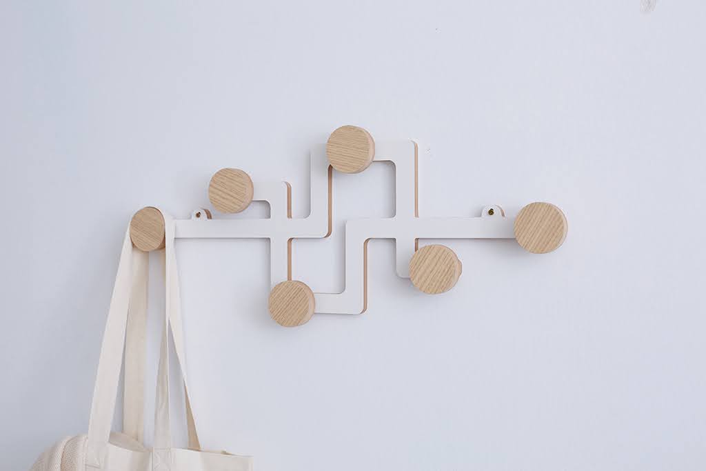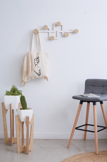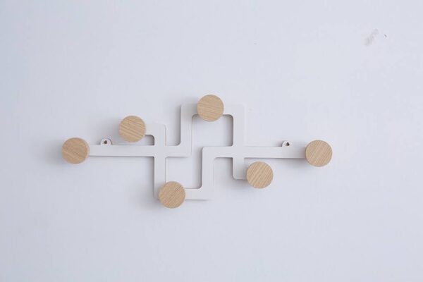 Perchero Nina. Melamina blanca de 12mm y melamina roble de 18mm. Se entrega armado y contiene 2 tornillos + 2 tarugos para ser amurado a la pared. Medidas: 60x25x5cm.
