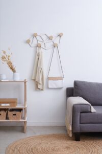 Perchero Vitto. Melamina blanco de 12mm y melamina roble de 18mm de espesor. Se entrega armado y posee 2 tarugos + 2 tornillos para ser amurado a la pared. Medidas: 60x30x5cm.
