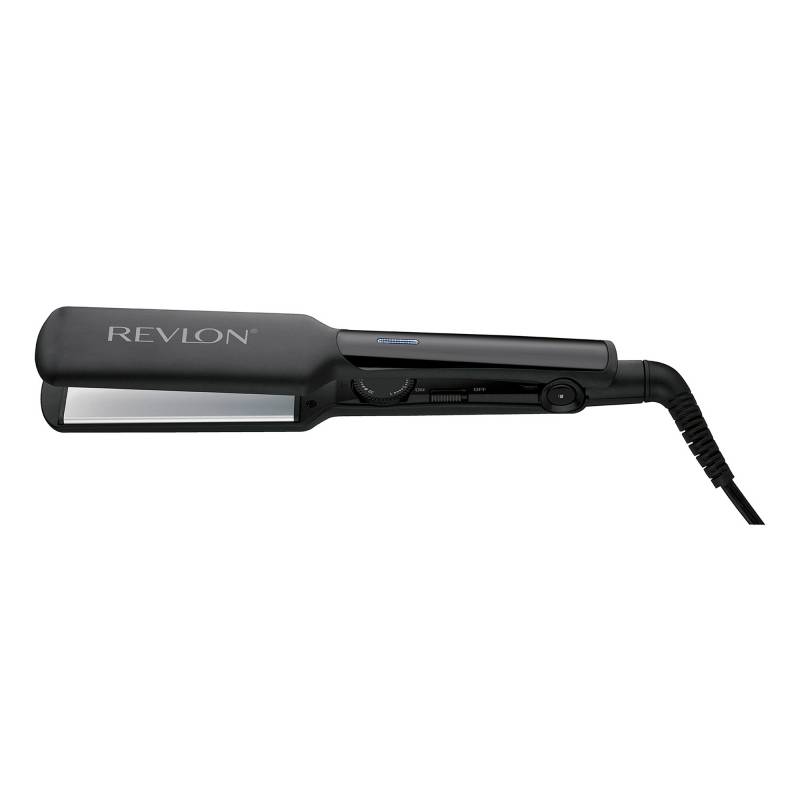 Marca Revlon. Planchita para pelo. Modelo RVST2182LA2. Placas de cerámica anchas. Temperatura máxima alcanzada 220°C. Selector de temperatura. Indicador led de encendido. Botón de bloqueo de placas. Cable giratorio de 2 metros