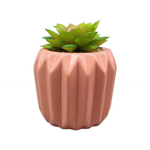 Planta artificial en maceta geométrica baja. Cerámica esmaltada color rosa, acabado brillante. Dimensiones: 9x9x8cm
