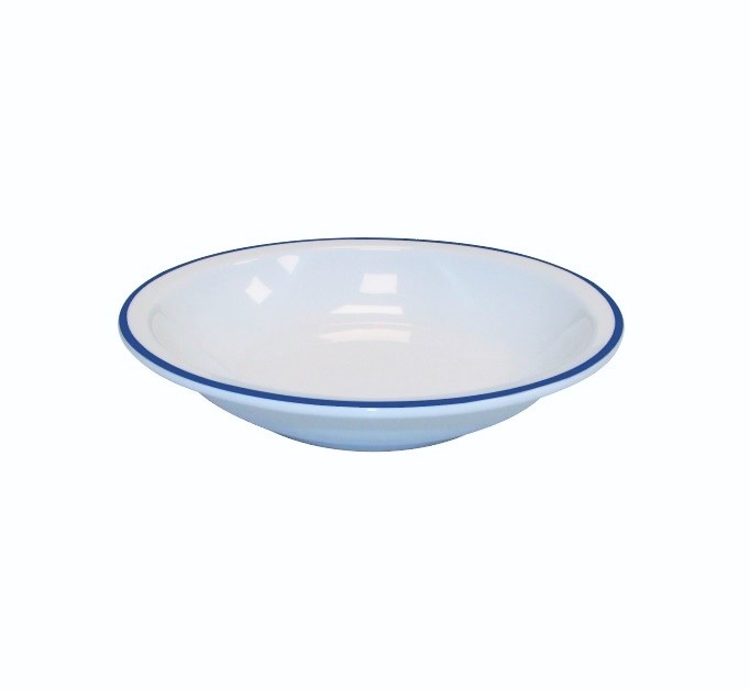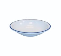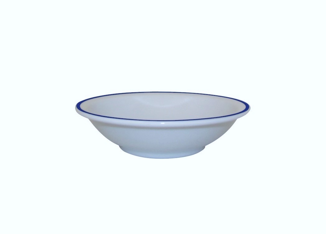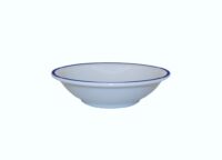 Marca Tsuji. Plato hondo de porcelana blanca decorada con filete azul en borde. Apto lavavajillas, horno, freezer y microondas. Diámetro: 20cm. Peso: 453g