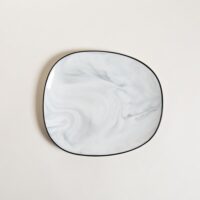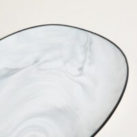 Plato playo fabricado en porcelana de excelente calidad, baja porosidad y tacto suave. Línea Filippo. Diseño irregular símil mármol en color blanco y gris con borde negro. Estilo moderno y sofisticado. Medida: 26,5cm de largo x 23,5cm de ancho. Apto lavavajillas. Apto microondas. Apto horno.