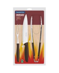 Marca Tramontina. Línea Plenus. Kit Churrasco 3 piezas. Láminas de acero inoxidable y mangos de polipropileno color negro. Cuchillo, tenedor y pinza. Presentación en blister.