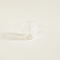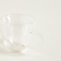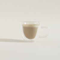 Pocillo de café de vidrio trasparente doble capa. Este diseño mantiene el café caliente por más tiempo. Evita que se forme condensación en el exterior de la taza. Capacidad: 150ml.