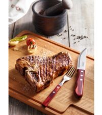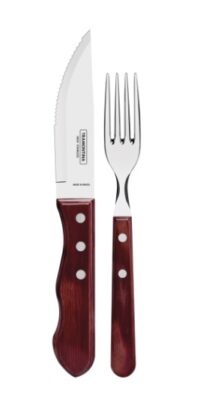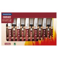 Marca Tramontina. Línea Polywood-Churrasco. Juego de cuchillo jumbo y tenedor. Acero inoxidable. Mangos de madera tratada Polywood color rojo, resistentes a impactos y altas temperaturas. Remaches de aluminio. Apto lavavajillas. Incluye: 6 cuchillos para asado jumbo 5″, 6 tenedores jumbo. Cantidad de piezas: 12